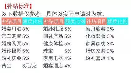 婚补基金面向领取结婚证一年之内的新人,补贴标准为黄金3元/克,汽车消费500元/辆,婚纱摄影等其他消费项目按平均消费额的5%予以补贴。