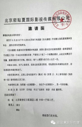 电视剧《功夫婆媳》将于8月20日下午三点在北京新世纪日航酒店二楼中华一厅和二厅举办开机暨主演见面和媒体发布会,热切期待各位领导们的光临。