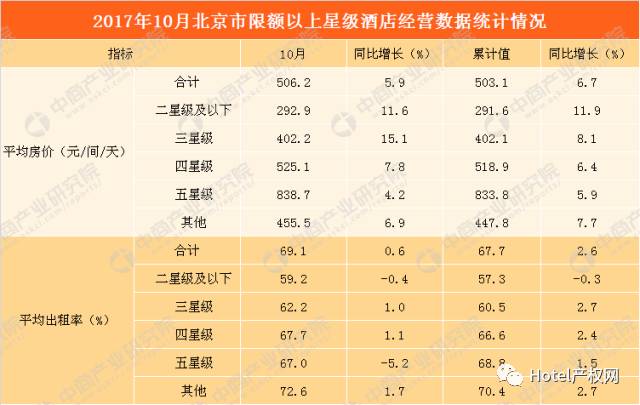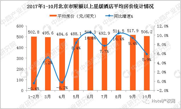 日前,北京市统计局公布了2017年1-10月经济运行数据,1-10月,全市实现社会消费品零售总额9253.4亿元,同比增长5.1%。其中,限额以上批发零售企业实现网上零售额1696.1亿元,同比增长9.6%。1-10月份累计住宿业收入379.5亿元,同比增长7.2%,10月住宿业收入40.26亿元,同比增长5.6%。北京市酒店业近年来发展整体有所提高,根据中商产业研究院《2017-2022年北京市酒店行业前景分析及投资研究报告》中数据显示:2016年全年国内酒店客房平均出租率为58.36%,与2015年相比下降了0.29%。2016年我国酒店平均房价为368.45元,同比下降了2.63元。以下对北京市2017年1-10月平均房价以及出租率做了简要分析。