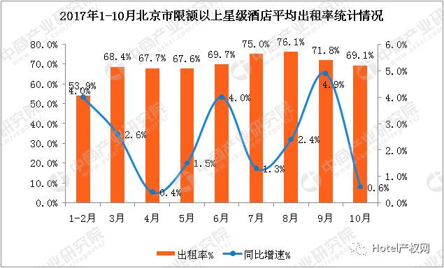 《报告》显示:2017年10月北京市星级酒店平均出租率为69.18%,与去年同期相比上涨了0.6%。整体来看,2017年星级酒店平均出租率与去年同期相比有所提高,其中6月份出租率同比增速最快达到4%,当月出租率为69.7%。4月份出租率与去年相比基本保持一致,为67.7%,小幅增长了0.4%。2017年3-6月出租率波动不大,7-8月份出租率有一个明显的提高,但是9-10月份北京星酒酒店出租率有所下滑。