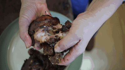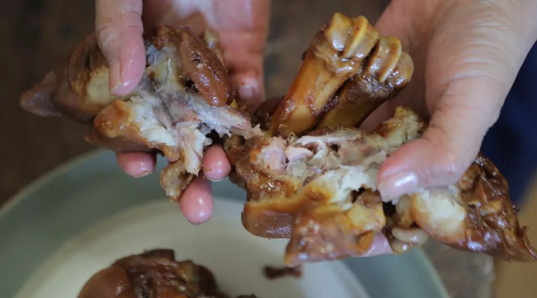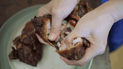 猪蹄帮的猪蹄是这次购买的所有酱猪蹄里最软烂的,从动图就可以看出,撕起来很轻松,而且猪蹄个头很大。