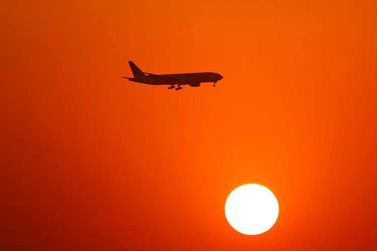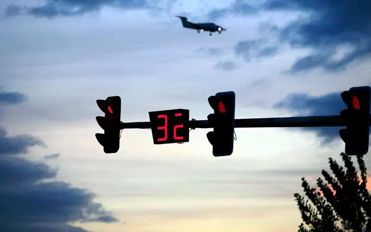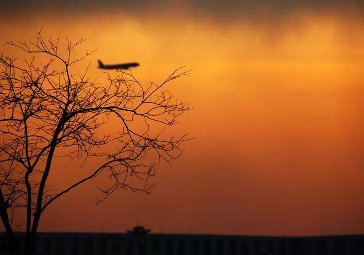 酒店路口的红绿灯,在夕阳中,也和飞机有了画面。背景中的小飞机,不是客机,是民航局的校飞飞机,专门用来检验机场跑道是否符合使用标准的。
