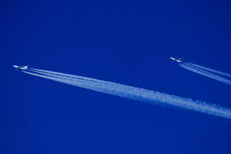 这张是偶然之得。某个冬天的下午3点多,汉莎的空客A340-600和荷兰皇家B747-400“编队”经过首都机场上空。这两种机型都是4发的,所以注意拉烟都是4条的。飞友说是从东京过来的航班,飞去欧洲。