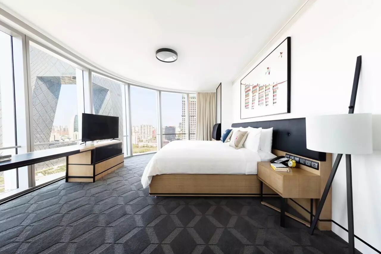 450间现代时尚的客房及套房以中性柔和作为整体空间的主色调搭配当今流行颜色点缀,让疲惫奔波于旅途中的宾客进入房间的那刻眼前一亮。具有现代感的工作空间包括多个USB接口和无线网络连接配备。宽敞的客房面积以40平方米起步,巨型落地窗的设计最大化的满足采光需求。身处于酒店的任一房间均可观赏北京的城市美景,其中100间客房和40间套房更是将城中地标建筑,由雷姆•库哈斯主持设计的央视总部大楼轻松纳入眼帘。