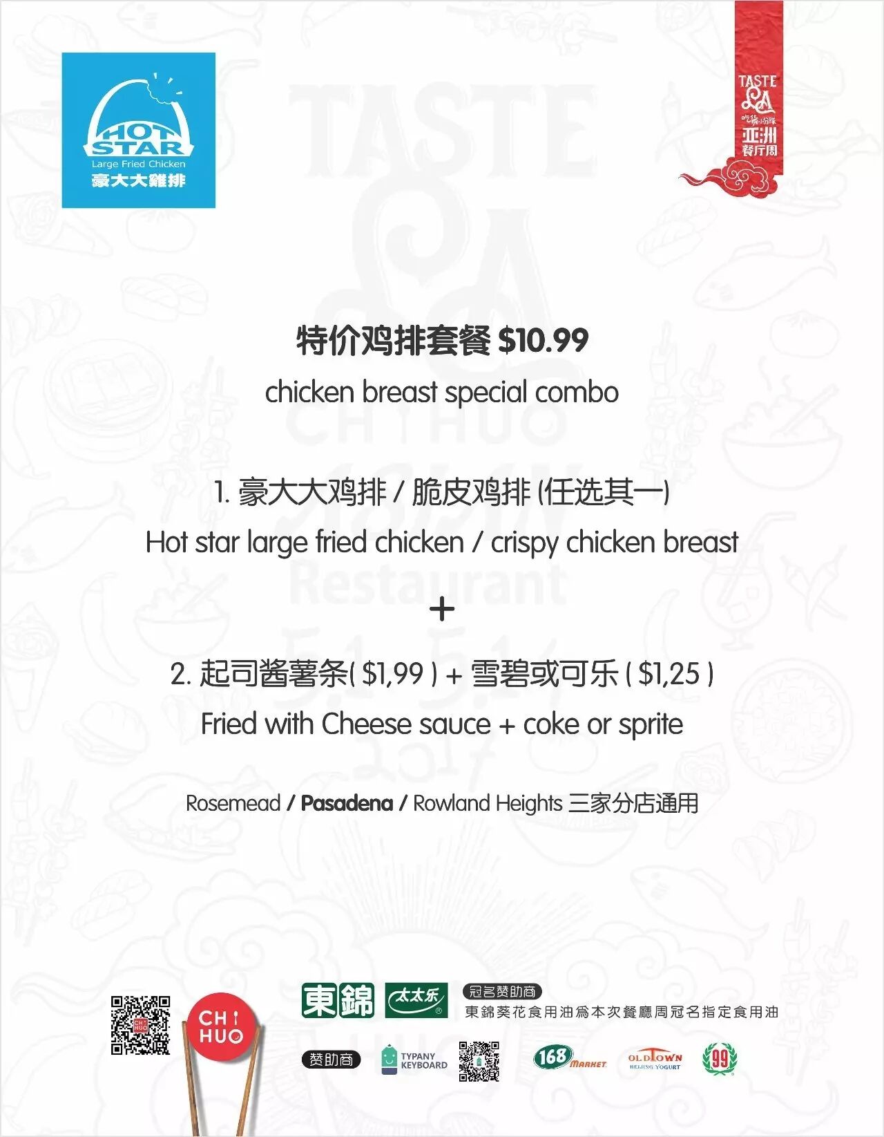 台湾著名的豪大大鸡排也来加入餐厅周!外表酥脆,内心柔软——比小分队妹子脸还大的鸡排早就是洛杉矶吃货们打卡必经之地了,香甜的甘梅薯条,还有参加餐厅周的起司酱薯条都是特别好的配搭。--对了,Pasadena的小伙伴你们有福了,最近新开的豪大大分店就开在你家门口!以及现在三家分店都会参加餐厅周哦!这次的特价鸡排套餐也是无敌划算