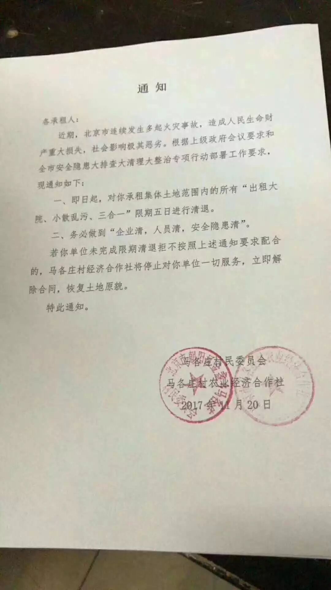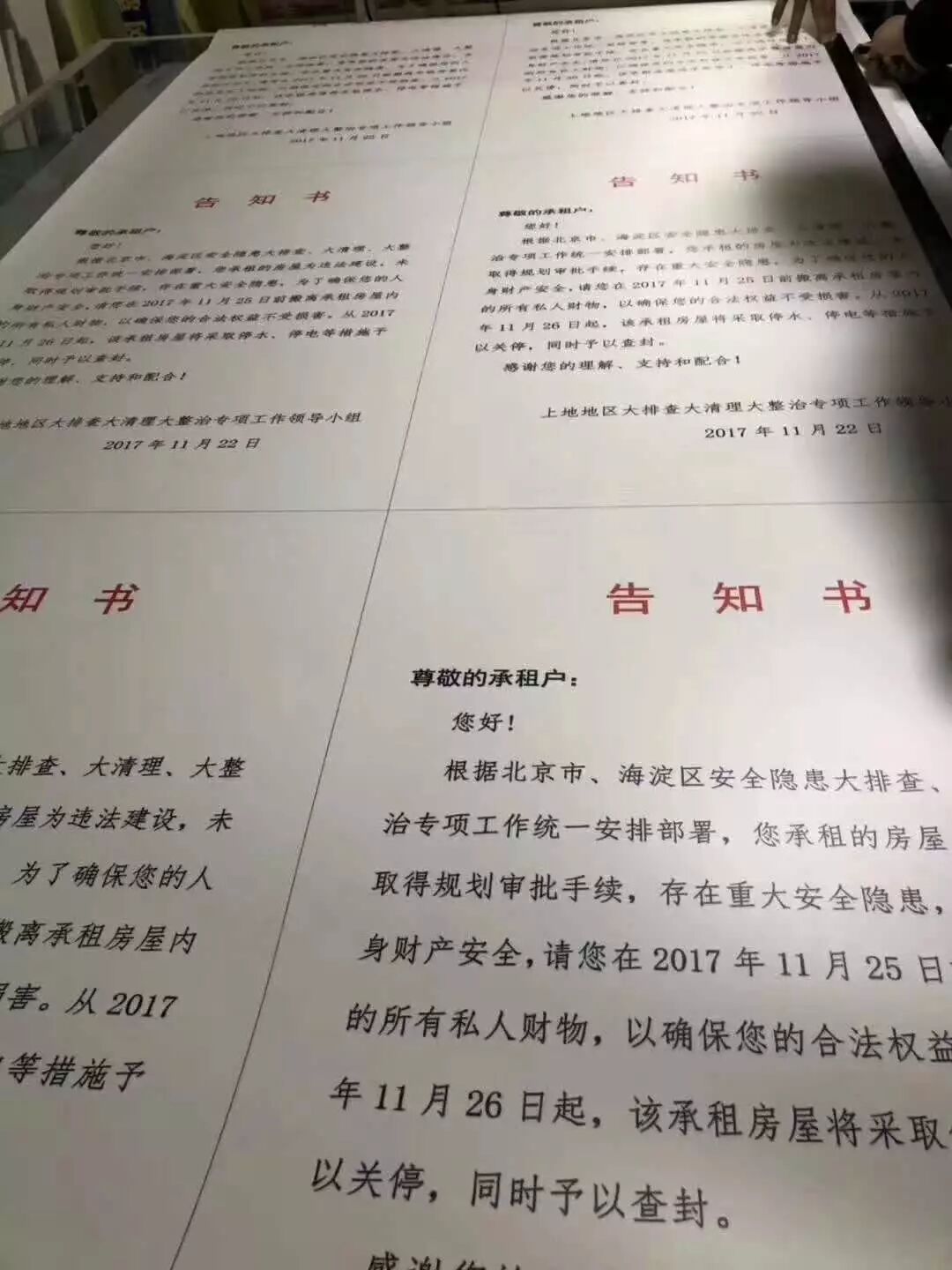 接下来北京市21个部门进行为期40天的隐患大排查大清理大整治专项行动,新建村作为事故的源头,以其为中心,辐射了北京全部的乡镇村庄,专项彻底清理排查,所有的,是所有的“出租院、小乱散污、三合一”五日内清退,做到“企业清、人员清、安全隐患清”。11月26日将强制断水断电断气,逾期者将立即解除合同,停止服务,恢复土地原貌。