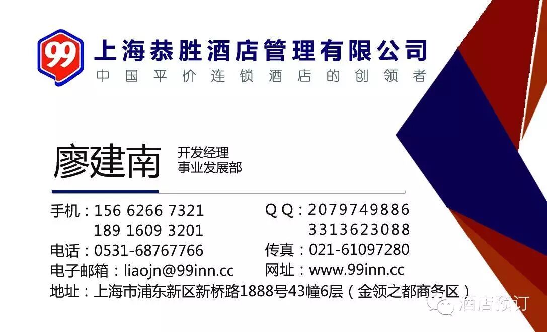 上海恭胜酒店管理有限公司是国内最大的平价酒店管理集团,首创“平价连锁酒店”行业标准,旗下99系平价酒店品牌:99旅馆连锁,99优选酒店,99新标酒店。便利快捷,价格亲和,随性自由。99,想住就住。
