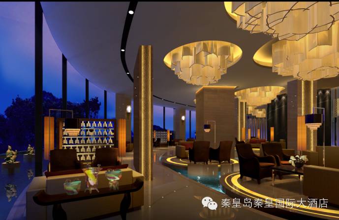 秦皇国际大酒店的整个大堂从艺术的角度来演绎中国深厚的文化,将秦王朝及汉唐历史文化与现代的时尚简约巧妙融合。前台接待背景运用中国古文字和长城作为装饰,展现东方文化的韵味。高空间、大进深、空间风隔、围合的灵巧性,凸显现代中式特点。
