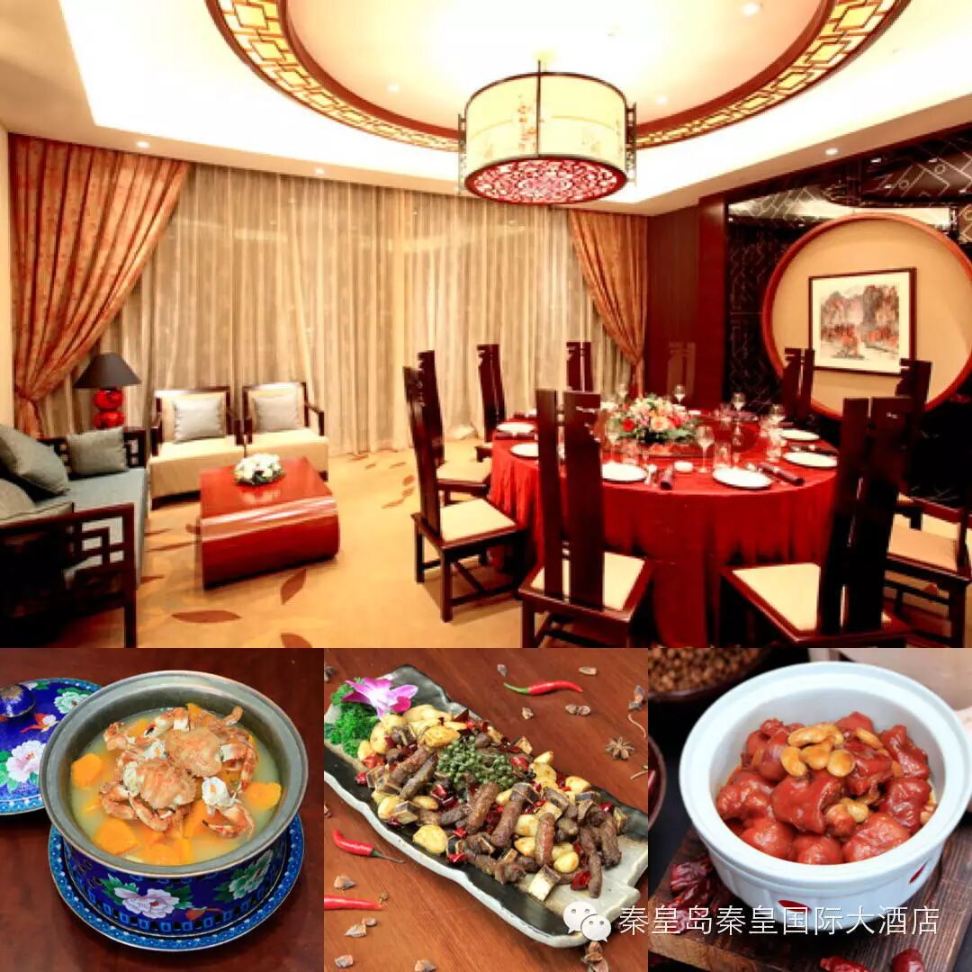 秦皇御宇天海奇珍 秦皇国际大酒店拥有46个观海中餐包间,将纯美的空间与顶级美食融为一体。所有食材精挑细选,道道佳肴令人赏心悦目。临窗而坐,伴着海风、听着潮声,感受至尊风情。
