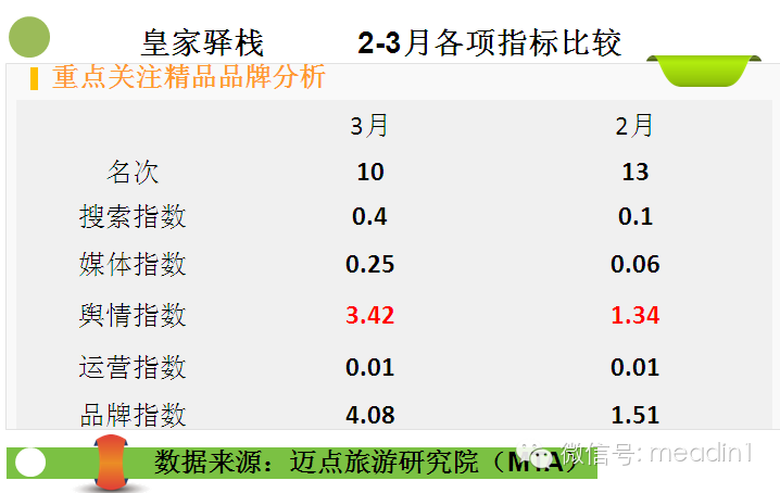 3月,皇家驿栈酒店品牌指数为4.08,较上月增加2.57,环比增长170.20%,是本月环比增幅最大的酒店品牌。本月指数排名第十位,较上月上升3位。从细化数据看,皇家驿栈酒店品牌指数提升主要得益于舆情指数的增加。本月舆情指数为3.42,较上月增加2.08。另外搜索指数和媒体指数较上月都有不同程度的增长,分别上升0.3和0.19。运营指数和上月持平。