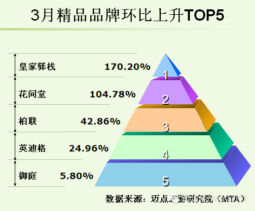 具体从品牌指数环比增幅上来看,3月皇家驿站的指数环比增幅较大,达到170.20%。位列增幅榜第二、第三位的是花间堂和柏联,其指数环比增幅分别104.78%和42.86%。