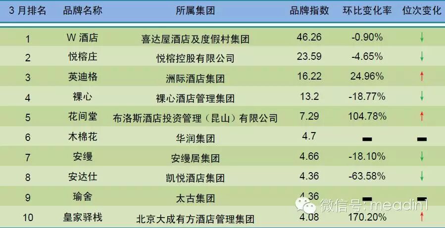(2)从名次变化看,3月名次上升的品牌数量有3个,下降和持平的品牌数量则分别有12个和3个。其中花间堂品牌位次较上月上升最为显著,共上升4位。另外,皇家驿栈和英迪格较上月分别上升3位和1位。