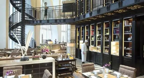 酒店的餐厅有一个非常有特色的亮点,三层的开阔图书馆式的建筑让你仿佛置身于欧洲的巨大图书馆内,每一层的众多展柜,都有好看又好吃的美食。