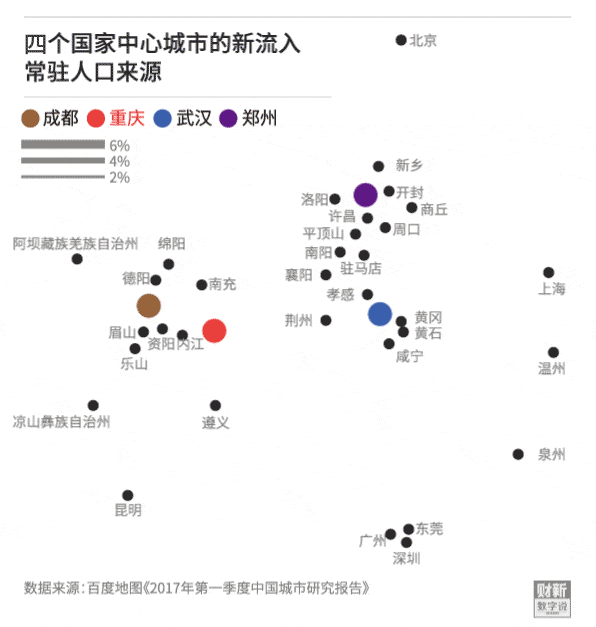 成都、重庆、武汉、郑州,这四个城市是持续有新人口流入的。而且主要来自周边小城,或者是大城市回流。