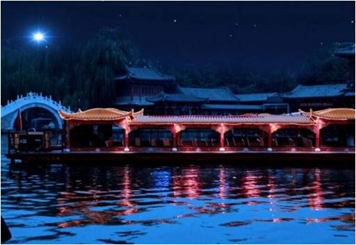长河在北京城的发展中起到过重要的作用,其中一个作用就是泛舟河间,赏皇家美景。清代《京城古迹考》记载:“桥在西直门外半里……水从玉泉来,三十里至桥下,夹岸垂柳,绀宇亭台,酒旗掩映”。泛舟赏月在这里是再合适不过了,长河河面水光潋滟,两岸树影婆娑,柳枝摇曳,轻拂水面,清风送爽,行舟其中惬意不言自明。
