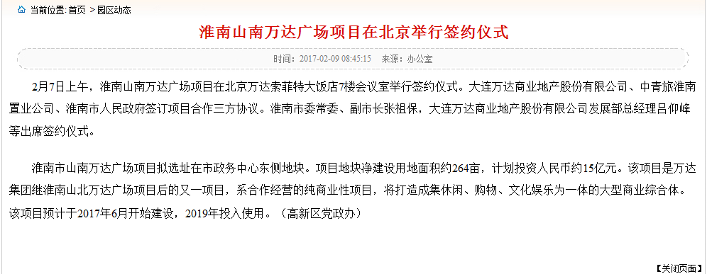 大连万达商业地产股份有限公司、中青旅淮南置业公司、淮南市人民政府签订项目合作三方协议。淮南市委常委、副市长张祖保,大连万达商业地产股份有限公司发展部总经理吕仰峰等出席签约仪式。