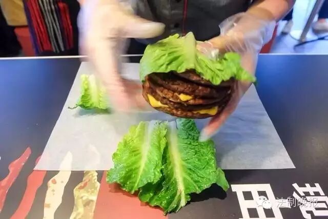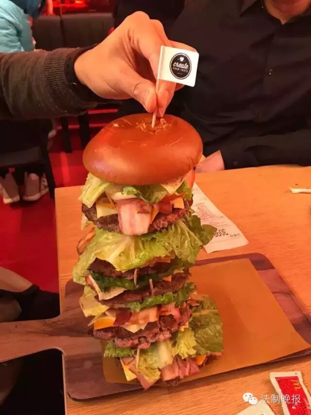 如果这样一份材料反复来五份,都加在两片面包间,那样的汉堡小编只能用“丧心病狂”来形容。好吧,小编我就喜欢丧心病狂型的~给你们看看图,舔屏吧~~据说这个汉堡根本不能用自身的重量来“站”住,只能用牙签来一层层的固定,吃的时候别忘了先拆开。